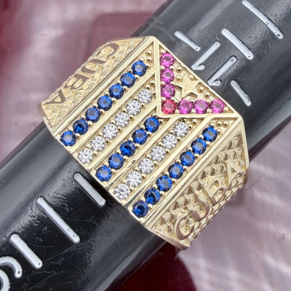Rock this stunning 14k gold Cuban flag ring that celebrates your heritage in style. Crafted with vibrant blue, white, and red CZs that pop against the precious metal, this piece weighs a solid 7.3 grams and fits a size 10.5. Whether you're repping your roots or adding some cultural flair to your collection, this ring makes a bold statement. Each purchase includes a complimentary polishing cloth to keep it looking fresh and a gift box perfect for gifting or storing. A timeless piece that's got serious character.