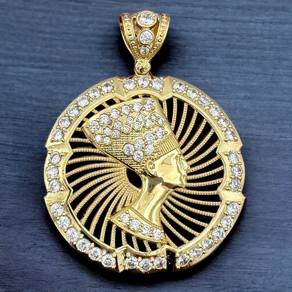 This stunning 3” Nefertiti pendant is crafted from 14k gold and set with a brilliant cubic zirconia centerpiece and rim. It features a generous 10mm bail clearance and weighs 28 grams. Arrives in a luxurious gift box with complimentary polishing cloth.