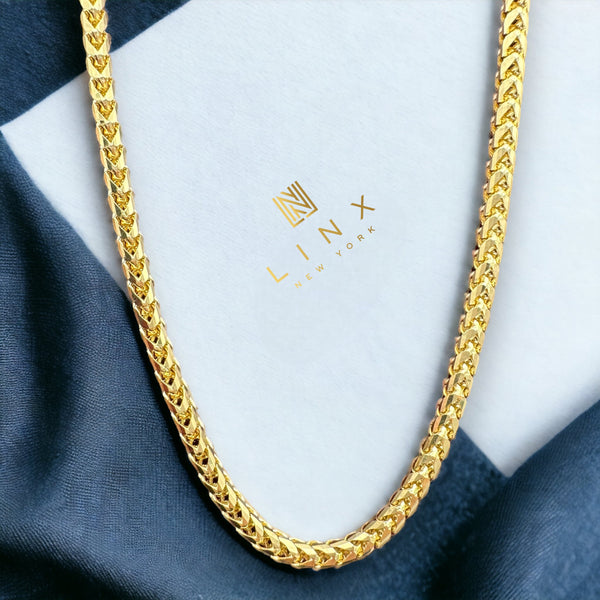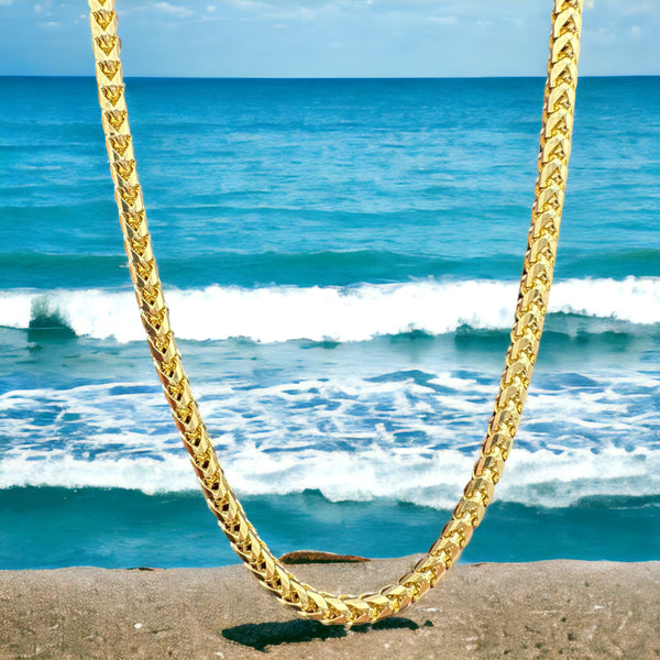 This luxurious 3mm 14k Solid Gold Diamond Cut Franco Chain features a diamond cut finish for an outstanding sparkle. It's hallmarked with 14k on a lobster clasp, with a weight of 17.3 grams for an 18" size. Complimentary gift box and polishing cloth included. Custom size (anything other than 18 inches) orders are not refundable.