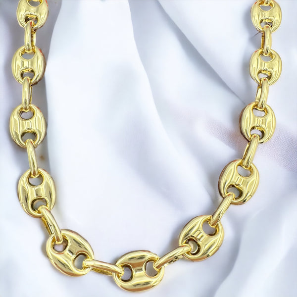 This exquisite 14k yellow gold necklace showcases a luxurious puffed mariner link design for an elegant, eye-catching finish. Weighing 19.6 grams at 18" and measuring 7.7mm wide, this beautiful piece features a secure lobster claw closure for added assurance. Make a glamorous statement with this exquisite necklace.